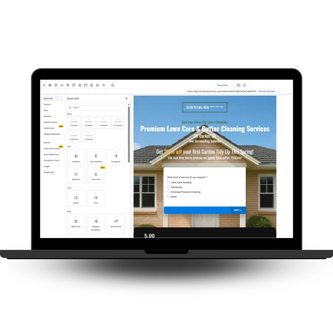 Create high-converting forms and landing pages tailored for home services in Australia —no tech skills required. With Inspire App drag-and-drop builder, you can design pages that match your brand, highlight your services, and capture valuable customer details.